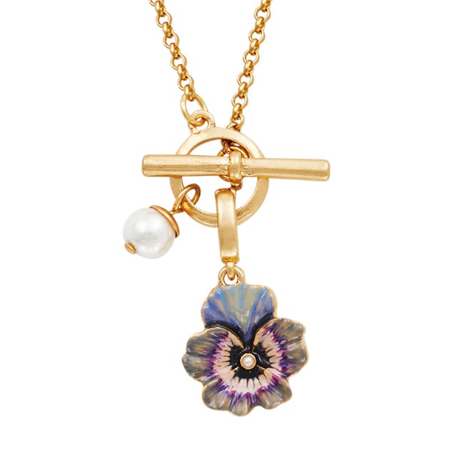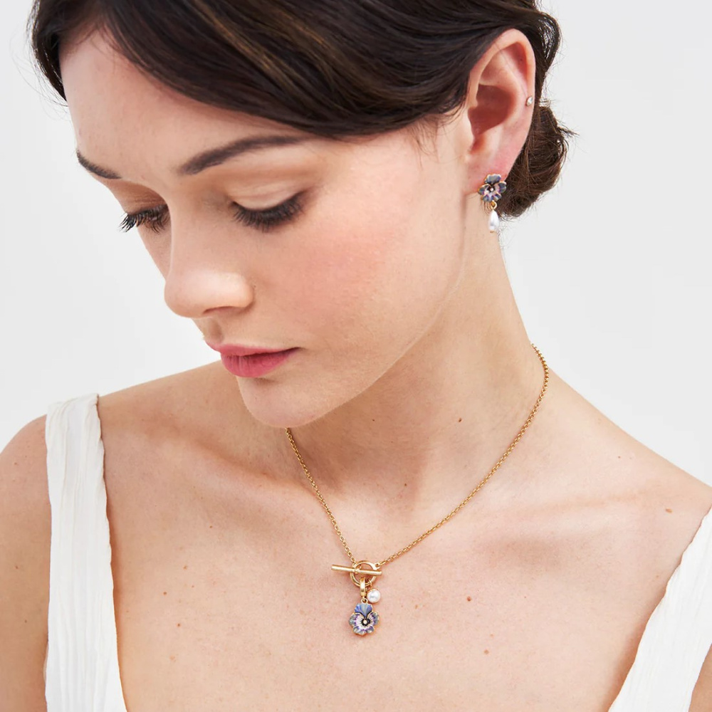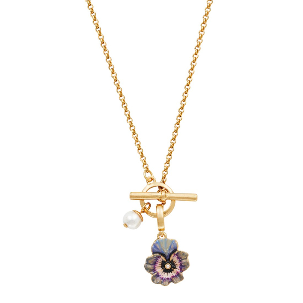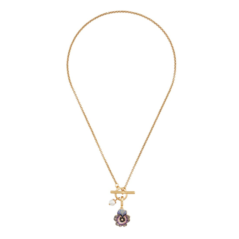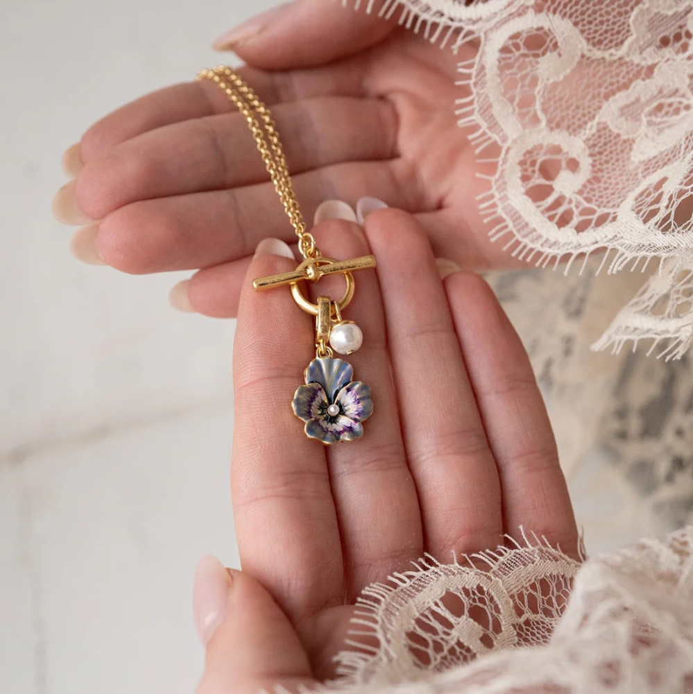 Gi antrekket ditt et hint av maritim sjarm med dette delikate Pansy & Pearl Toggle-halskjedet fra Fable England. Smykket er laget i messing med en eksklusiv 22 karat gullbelagt finish, og kombinerer en signatur stemorsblomst i håndmalt emalje med en klassisk perle for et mykt og sofistikert uttrykk.