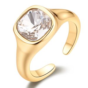 Den iøynefallende, fasettslipte krystallen fanger lyset på en vakker måte og gir ringen et eksklusivt uttrykk, mens den varme gulltonen tilfører en luksuriøs finish. Den åpne, justerbare designen gjør ringen komfortabel å bruke og gir en fleksibel passform som passer de fleste fingre.